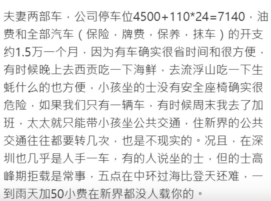 - 交通支出:家里养了两辆汽车,除了车位费,每月油费、保险、保养等费用约 1.5 万港元。网友对此质疑声最大,但贴主强调 “两辆车是刚需”—— 一来能节省通勤和出游时间,二来若只有一辆车,太太带孩子出门需多次换乘公共交通,现实中难以操作。