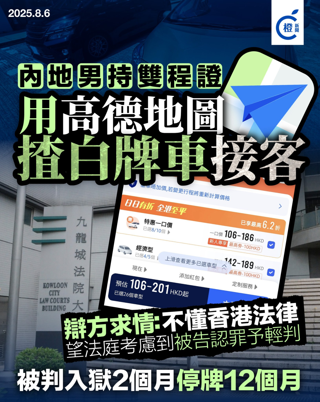 - 内地司机持商务签在港接单,被判监禁 2 个月有乘客使用高德打车时,发现司机既不懂粤语、也不熟悉荃湾路线。报警后,该司机被控 “违反逗留条件”“非法出租载客”“无第三者保险用车” 三项罪名,最终被判监禁 2 个月、吊销驾照 1 年。