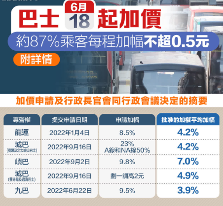 行政长官会同行政会议5月30日通过5间专营巴士公司的加价申请,加幅由3.9%至7%不等,新票价将于6月18日起实施。在计及隧道费基金后,九巴实际平均加幅为3.9%;龙运巴士加4.2%;城巴及新巴的市区线实际平均加4.9%;而城巴机场线平均加4.2%;至于新大屿山巴士,则加价7%。
