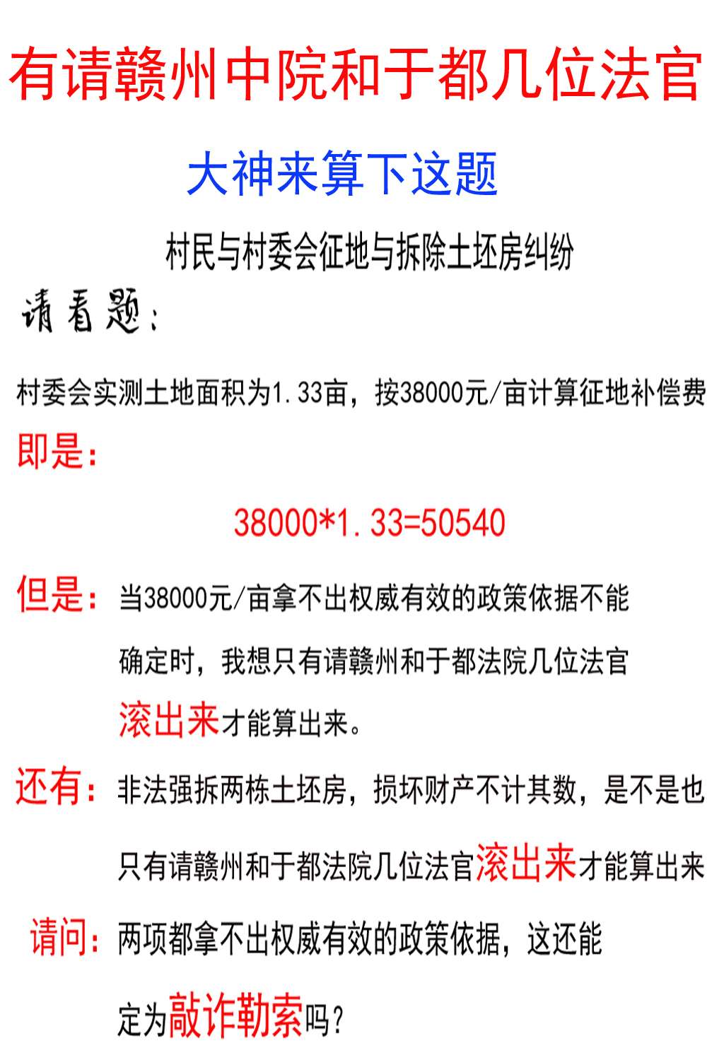 1.主审法官说订立什么协议并不是本案的核心问题。请问没协议书你拿什么认定“索取的大部分费用非村委会应当支付的”这种说法呢?没协议书这案件还能成案吗?为什么村委会不惜伪造协议书签名也要搞出协议书出来呢?那岂不是于都县罗坳镇三门村委会按38000元/亩计算征地补偿款单价也是凭空冒出来的吗?我作为一名非法律工作者都知道无论征地与拆除土坯房都得有一纸协议书(这是双方利益的保障基础),且村委会不是个人而是一级组织,难道你会不知道吗?