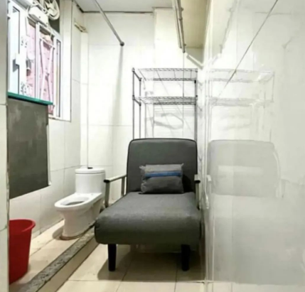 从相片见到,单位是由厕所改装而成的“厕所房”,马桶安装在原本冲凉水槽位置,却没有附上厕所板;厕所旁边放了1张梳化床,几乎已佔了单位一半空间。