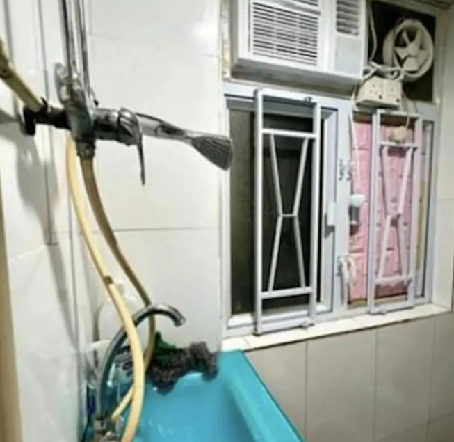 厕所旁还放有1部电视机,电视机上是1个锌盘和水喉,供住客梳洗之用,看似相当狭窄。单位另设有2扇窗、1部冷气机和1部抽气扇。