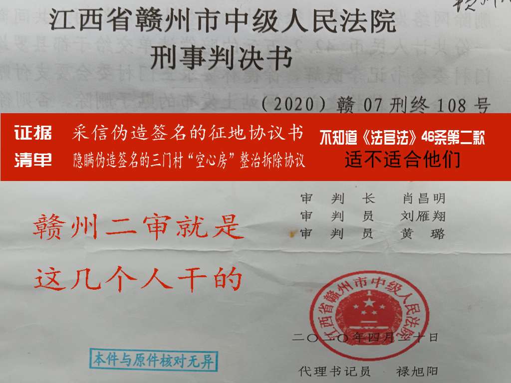 其次,现在讲第二个财务的问题,既然说到这个财务,那“财”肯定是有价值的对不对,价值又是以数字来体现的,但在这个本案中,无论征地与拆除土地房均没有权威有效的政策依据来支持计算金额,并且村委会原班子,还采用伪造征地协议书签名和伪造《三门村“空心房”整治拆除协议书》签名,相关法律是规定,伪造签名的合同或协议是没有法律效力的,所以没有协议书和政策依据,那就请问法官拿什么标准来计算认定敲诈勒索数额?另外,判决书证据清单中还隐瞒了《三门村“空心房”整治拆除协议》这个文件,隐瞒了这份文件就等于是隐瞒了强拆村民2栋土坯房损毁不计其数的财产事实,大伙觉得这个计算数额还准确不?