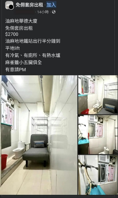 有业主于Facebook群组“免佣套房出租”发文,以2700元出租油麻地华德大厦1个长方形单位,标榜“油麻地地铁站出行半分钟到”、“平地lift(升降机)”、“有冷气、有厕所、有热水炉”、“麻雀虽小五脏俱全”。