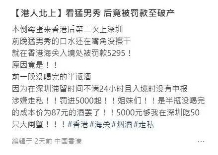 谁能想到,去深圳看场猛男秀、喝两杯小酒放松,回香港时竟被海关拦下,直接罚了 5295 港元?最近一位港女在社交平台的吐槽,直接让全网炸开了锅。这位姐妹本来美滋滋北上休闲,看完秀还剩半瓶酒没喝完,想着别浪费就塞包里带回去。