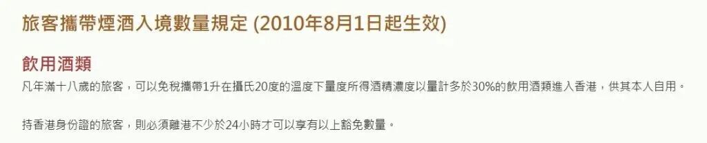 香港海关确实有规定,18 岁以上旅客入境,能免税带 1 升酒精浓度不超过 30% 的酒(葡萄酒除外),但这里藏着个关键 bug——