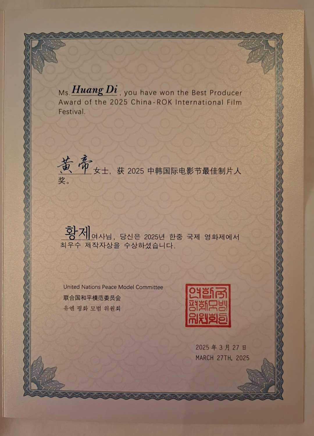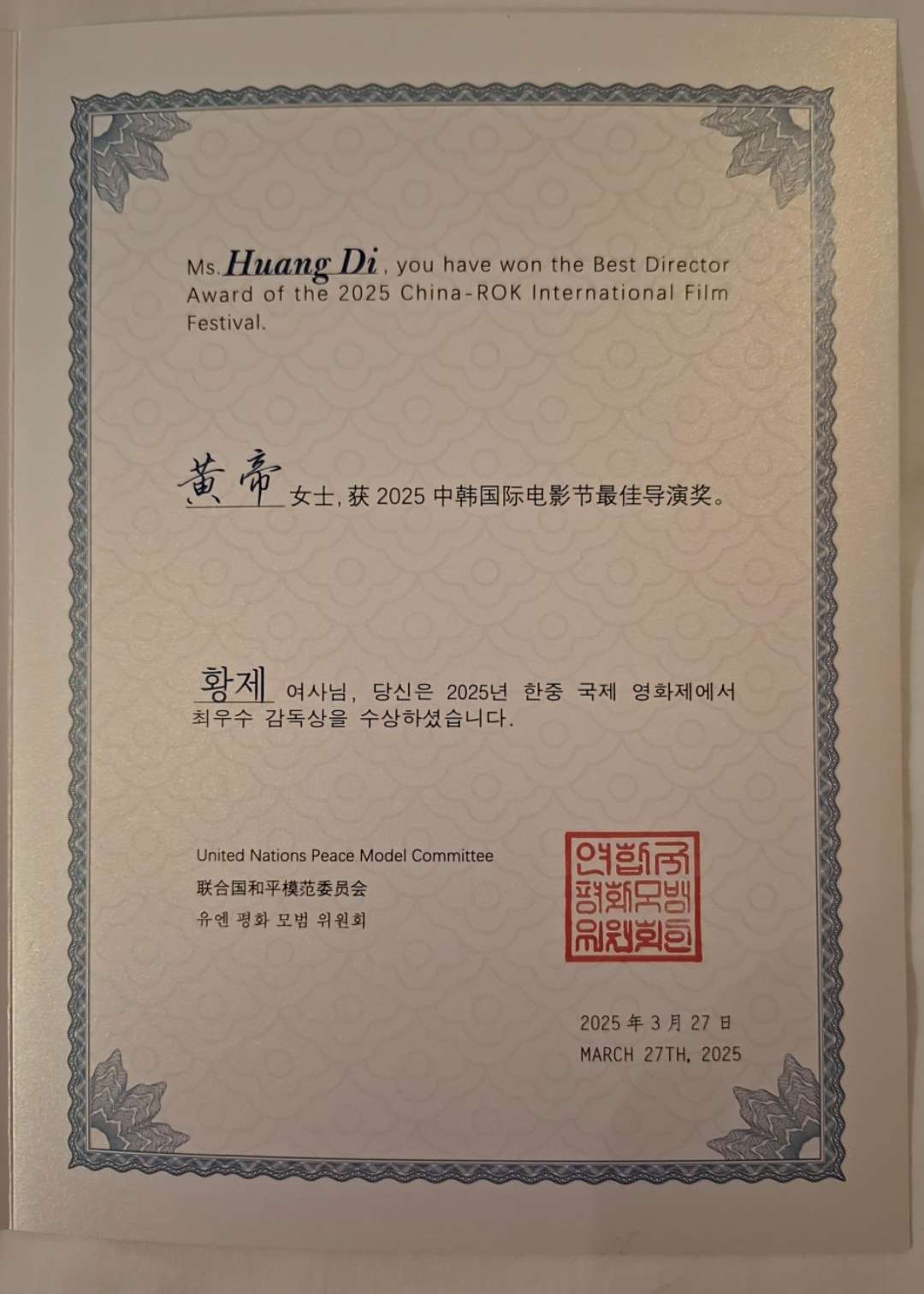 2025年3月27日,在韩国首尔举行的“联合国和平模范委员会”中韩国际电影节上,导演黄帝凭借鸟虫篆书法短片《永定门》一举夺得最佳导演奖和制片人奖。这不仅是黄帝个人艺术生涯的重大里程碑,也为鸟虫篆这一古老的艺术形式在国际舞台上赢得了广泛关注。