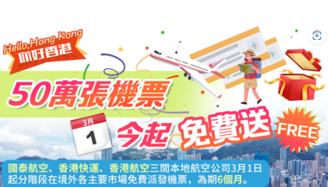 为一连串向全世界说好香港故事,推广香港商机、文化景点及旅客体验的活动揭开序幕,政府推出《你好,香港》宣传活动,本港将免费派发50万张机票提供给来自各地的旅客,或是世界上最大的欢迎旅客举措。机管局表示,50万张机票由本港3间航空公司向境外市场赠送,机票将由今日(3月1日)开始派发,为期6个月。