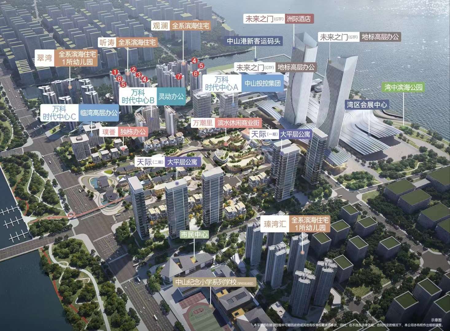 一桥:深中通道;一港:中山新客运码头;双站:广珠轻轨南朗/翠亨站;3轨道:中山2/4号线,广州18号线,深圳33号线,四快线:中开高速/翠亨快线/东部外环快线/世纪大道
