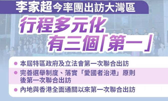李家超指出,今次的大湾区访问有三个「第一」,分别是第一次本届政府和本届立法会的联合出访; 在完善选举制度,落实爱国者治港原则后第一次联合出访; 亦是我们与内地全面通关后,最大规模的一个官式外访。 他认为,此行体现了在《爱国者治港》原则下和行政主导方针之下,政府官员与议员同心同德,互相配合、合作及监察,提升治理水平。 期望四天行程能让特区官员和立法会议员直接交流沟通,增加了解和增进行政立法关系。