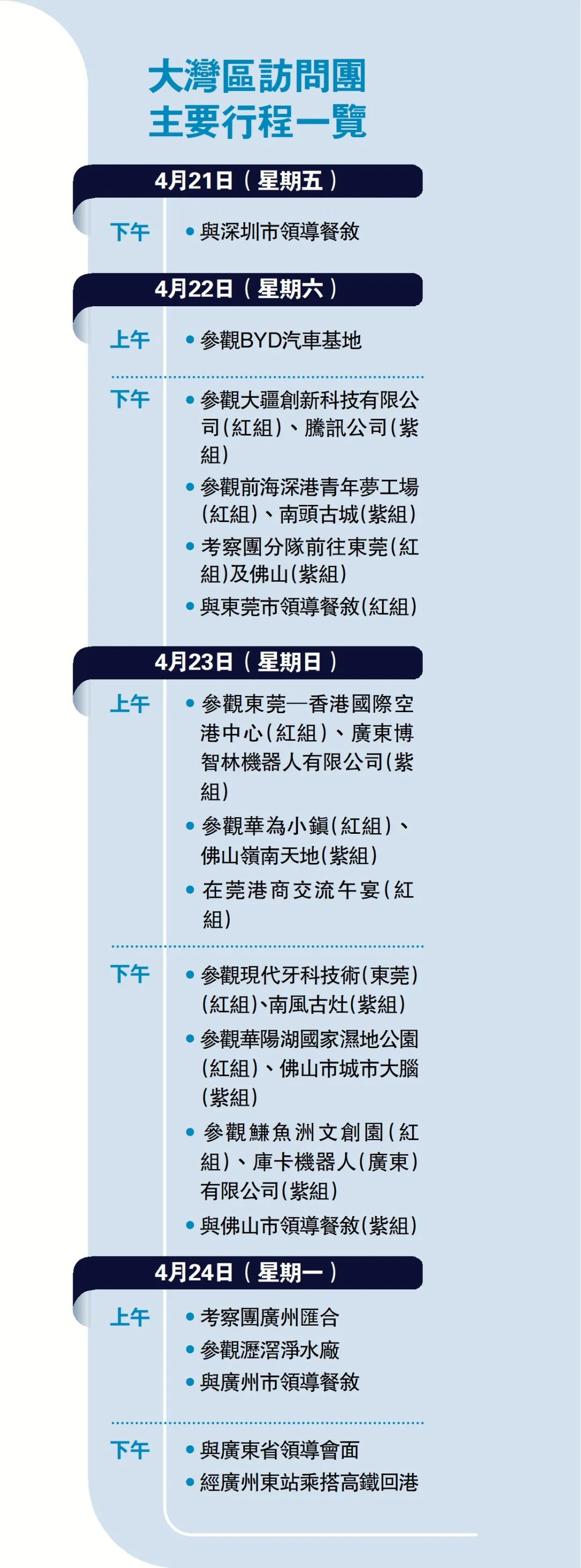 李家超昨日下午率团出发前会见传媒。 他表示,此次访问大湾区的安排高规格,行程丰富,访问团在四日内会依次到访深圳、东莞、佛山及广州四个大湾区内地城市。 由于人数众多,访问团在深圳开始会分为两队,一组访问东莞,一组访问佛山,最后在广州汇合。 他说,此次访问团考察范围多元,包括创科、环保、青年发展,以及文化体育的设施、项目,甚至企业,相信每一位参与访问的立法会议员都会觉得有用。