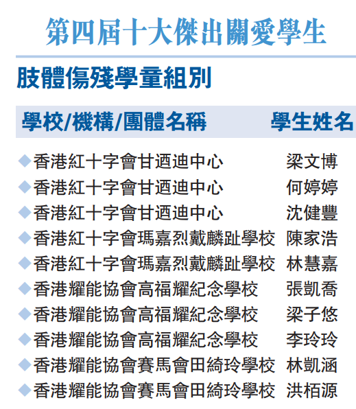 为了让社会大众更了解轻/中度智障及肢体伤残学生的发展潜力,香港特区中央狮子会自2020年起持续举办“十大杰出关爱学生选举”,昨日举行第四届颁奖典礼。有得奖的自闭症及轻度智障学生,一方面勤做家务尽力照料患癌母亲,同时努力追寻街舞和高尔夫球梦想,6月份将以港队身份出战世界特殊奥林匹克运动会,为港争光。另有脑瘫女杰生,多年来克服身体痉挛以及大大小小不同手术,中三开始毅然转读主流课程,甚至在昨日颁奖礼上仍拉着老师温习数学科,务求今日考好成绩,他日成为医护人员,帮助更多有需要人士。