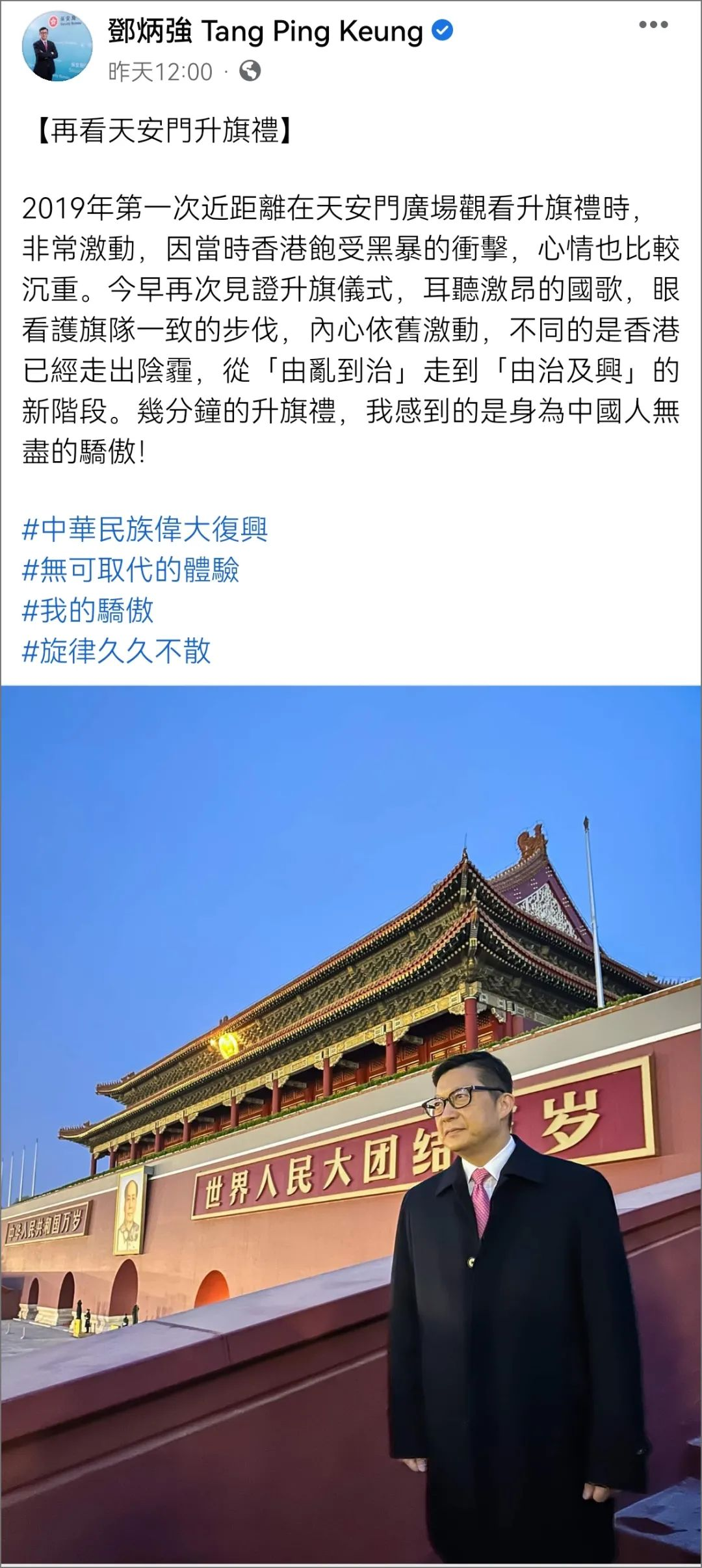 另外,邓炳强昨日在社交平台贴文“再看天安门升旗礼”,指自己2019年第一次近距离在天安门广场观看升旗礼时,非常激动,因当时香港饱受黑暴的打击,心情也比较沉重。昨晨再次见证升旗仪式,耳听激昂的国歌,眼看护旗队一致的步伐,内心依旧激动,不同的是香港已经走出阴霾,从由乱到治走向由治及兴的新阶段。“几分钟的升旗礼,我感到的是身为中国人无尽的骄傲!”