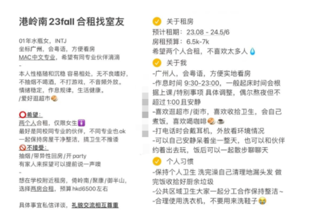 授课型研究生想要申请宿舍难度是真的挺大的,所以往年很多的新生同学们一般都会选择自行在外租房!当然啦,今年的新同学们也是“选择校外租房”的居多。有的同学为了找到一个跟自己更合得来的室友,来分摊租房费用,甚至已经开始发起了“合租简历”!