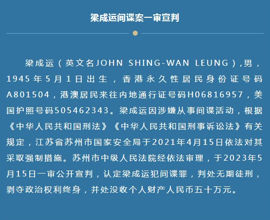 苏州市中级人民法院经依法审理,于2023年5月15日一审公开宣判,认定梁成运犯间谍罪,判处无期徒刑,剥夺政治权利终身,并处没收个人财产人民币50万元。