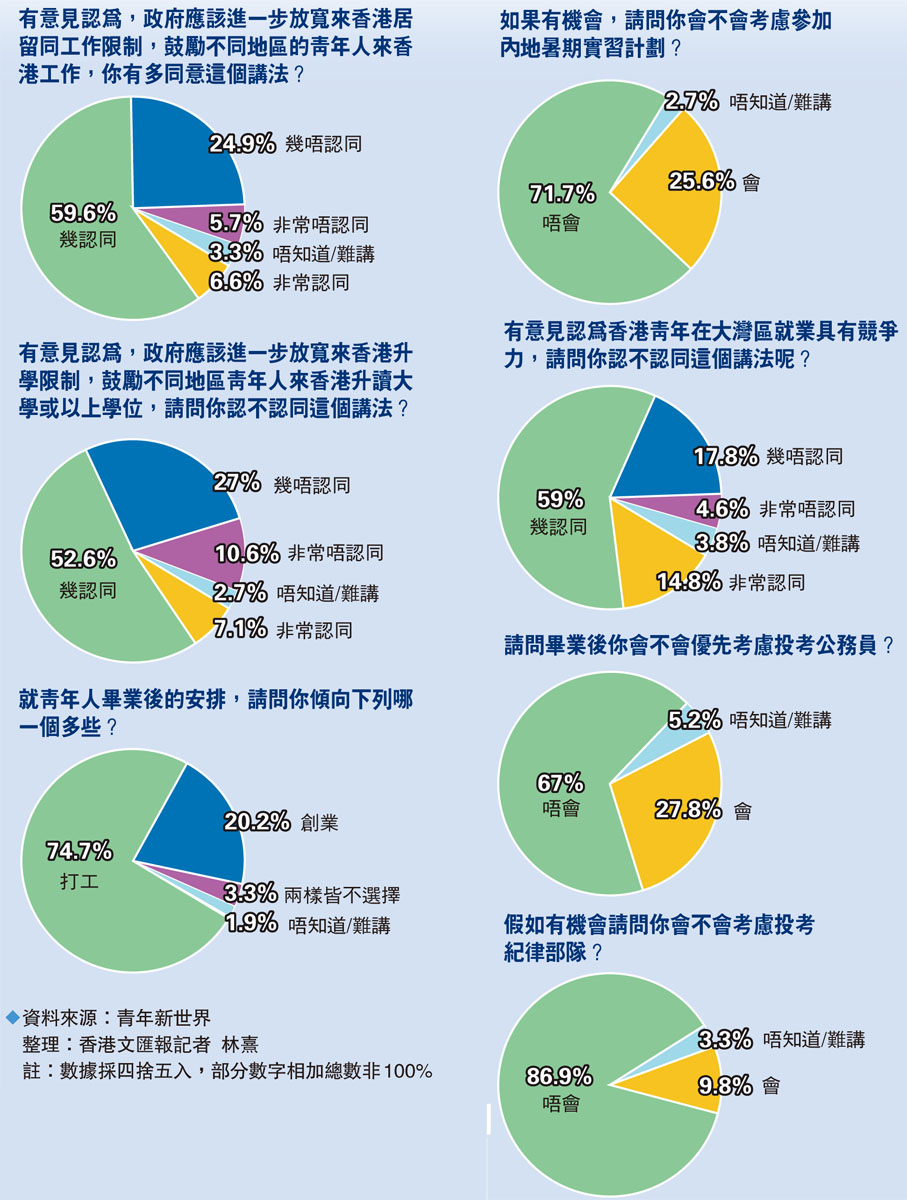一直致力为基层青少年服务的团体「青年新世界」日前建议特区政府应重视建立内地港生人才库,鼓励内地港生回流。该团体上月透过真人电话问卷调查逾360名应届文凭试考生会员,了解他们对人才及劳工议题的看法,昨日公布的调查结果显示,不足三成文凭试毕业生打算毕业后优先考虑投考公务员。团体呼吁特区政府加强招聘在内地大学毕业的香港学生,建议在武汉、广州及厦门等港生相对集中地区增设公务员考场。对于特区政府早前宣布放宽大学生投考公务员要求,容许大学生毕业前一年投考部分职位,「青年新世界」表示欢迎,认为有助政府更早吸纳人才,同时让青年大学生对未来事业发展有更好规划。