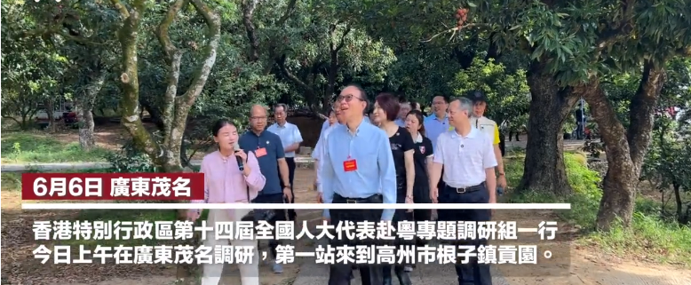 港区全国人大代表赴粤专题调研组一行,今日(6日)上午在广东茂名调研,第一站来到高州市根子镇贡园。来到原生态的园区,人大代表们见猎心喜,霍启刚第一个顺着梯子爬到枝干旁,亲手采摘500年荔枝树的果实。其他代表也纷纷体验亲手摘果的乐趣,品尝着自己的劳动成果,纷纷表示「很甜」,一方面是500年树龄的荔枝确实非常鲜甜,另一方面则是自己的劳动成果尝起来也是特别甜。