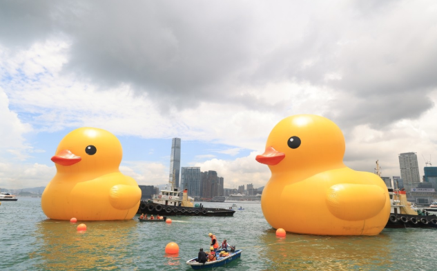 由荷兰艺术家霍夫曼制作的黄色巨型橡皮鸭,相隔10年后再度访港,于10日正式展出。展期原本预计两周,最新公布缩短展期。创办人表示,感谢各界支持,大型户外海上充气艺术装置本就需要面对不同天气及突如其来的外在环境挑战,经过连日观察,再衡量营运成本等因素,与专业团队商讨后认为最适合于本周日为展览圆满作结。