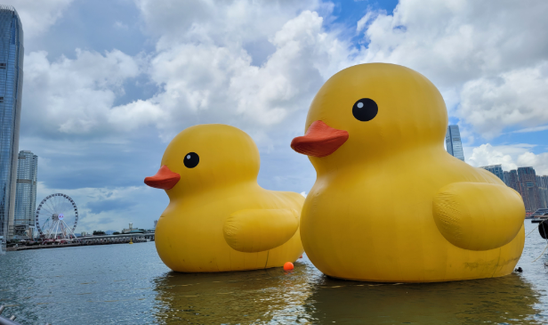 两只巨型黄色橡皮鸭在港掀起赏鸭热潮。《橡皮鸭二重畅》主办单位今日(16日)公布。其中一只橡皮鸭将于星期日(18日)、父亲节维港巡游,之后便会结束展期。