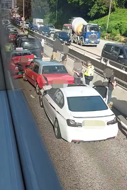 事故中无人受伤,警方接报到场调查。现场可见,多辆涉事车辆停泊在快线,有车辆车尾被撞至凹陷。