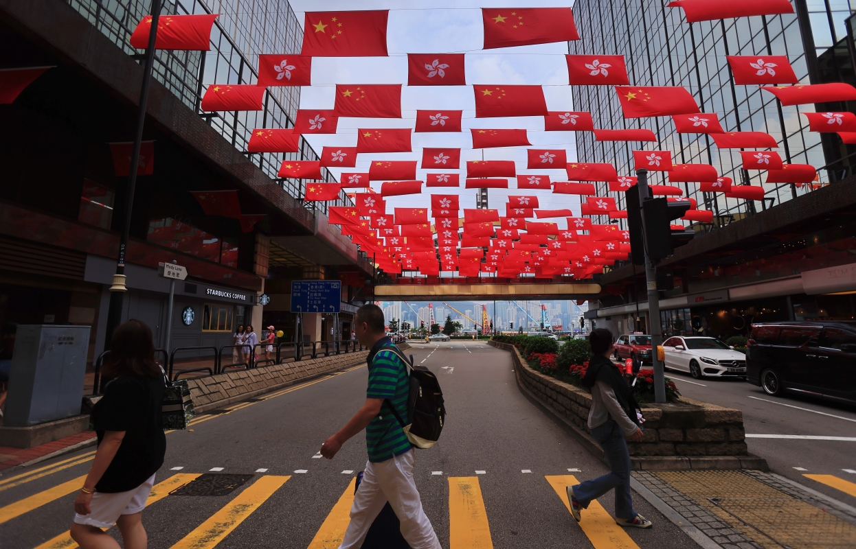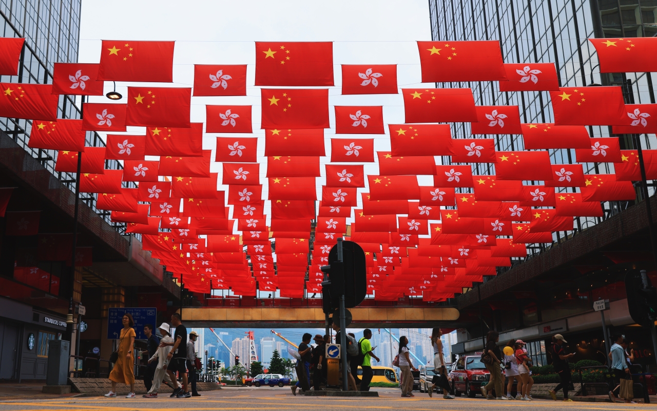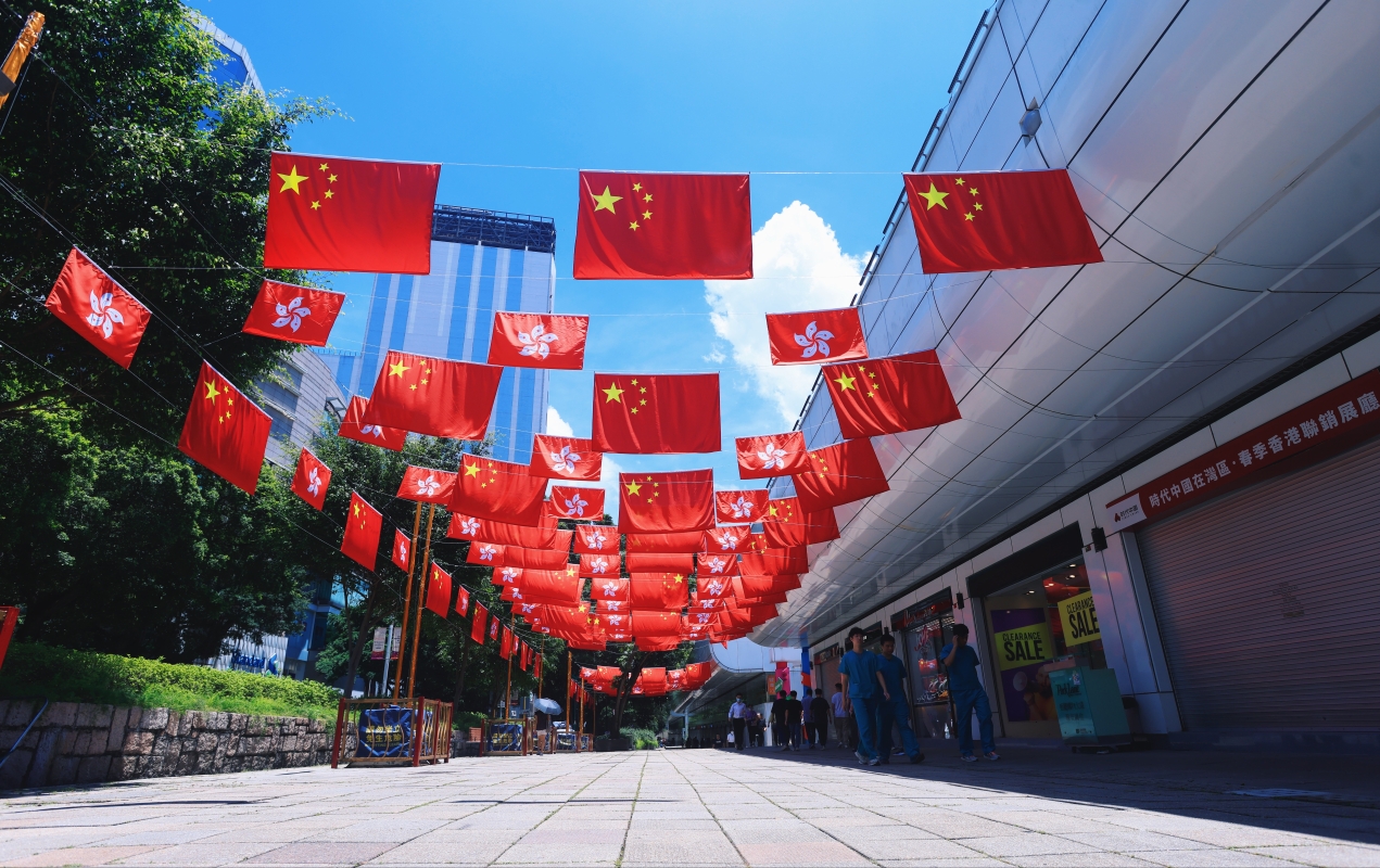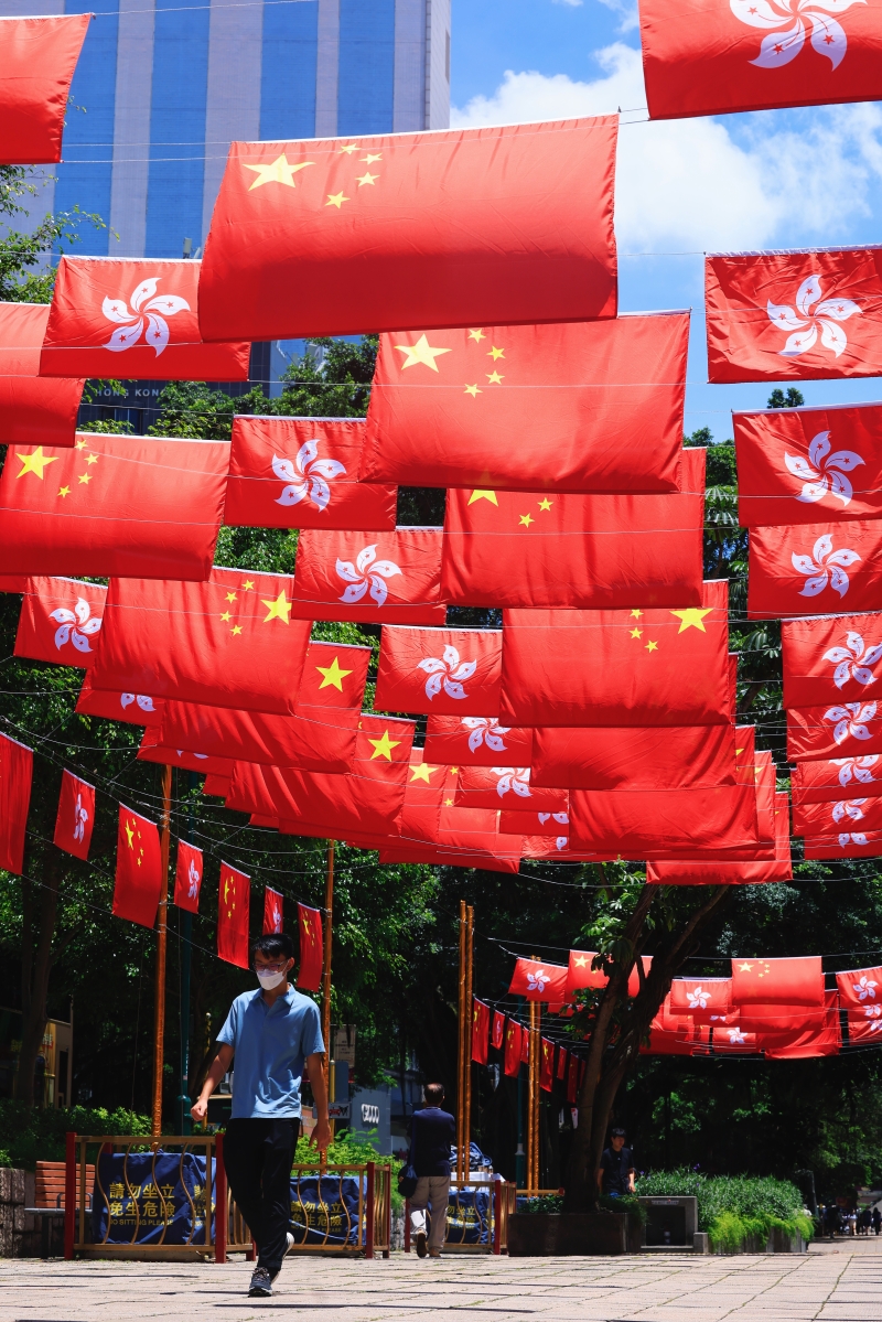 香港回归祖国26周年,尖沙咀街头多面国旗和区旗形成旗海一片,在蓝天的映射下将街道装点得格外美丽。
