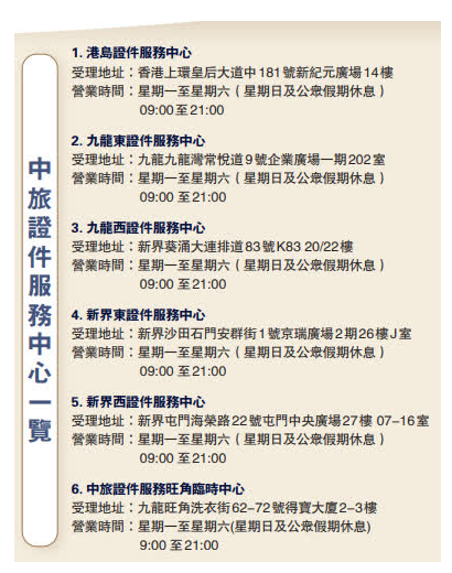 据介绍,中旅主要措施包括:一是迅速採购设备,招聘人手;二是加班加点,延长服务时间;三是与民建联合作,由民建联地区支部为社区不便上网长者提供预约服务,利用周日休息时间加班安排长者专场办证服务,至今已举办23次周日专场;四是对接特区政府教育局,连续多个周日为中学生赴内地交流学习开设19次专场办证服务;五是开设绿色通道,为有重要紧急事由者提供即到即办服务,尽量满足市民办证急需;六是经过一个月的紧张筹备,迅速开设中旅证件服务旺角临时中心,于6月1日正式对外服务。该中心位于旺角洗衣街得宝大厦,场地宽敞,专门为年满18周岁以上人士提供换证服务。该中心每天可受理3,000人申请,有职员专门协助客人操作智能受理设备,方便快捷,整个受理过程用时不足10分钟。其他5间证件服务中心也加大了未成年人和首次办证预约筹号,全面延长服务时间,以方便假期学生、婴幼儿办理证件。
