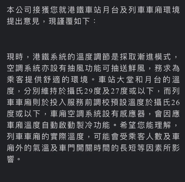对此,有市民向港铁公司发投诉信指出有关情况,港铁对此回覆表示,现时港铁系统的温度调节採取渐进模式,车站大堂和月台的温度分别维持于摄氏29度及27度或以下,列车车厢则于投入服务前调校预设温度于摄氏26度或以下。车厢空调系统有感应器,会应温度自动启动制冷功能。