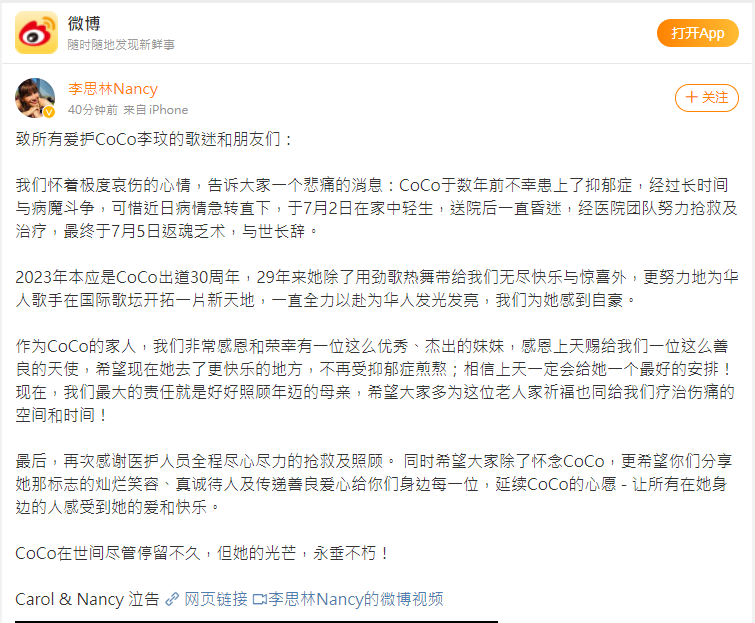 据李玟的二姐李思林5日晚间在新浪微博发文公佈,李玟CoCo于数年前不幸患上了抑郁症,经过长时间与病魔斗争,可惜近日病情急转直下,于7月2日在家中轻生,送院后一直昏迷,经医院团队努力抢救及治疗,最终于7月5日返魂乏术,与世长辞。终年48岁。