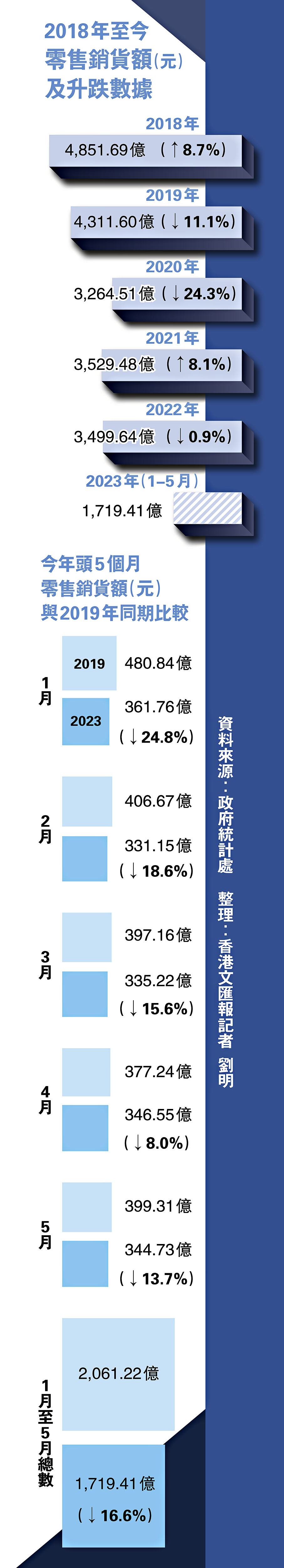 香港社会在疫情后全面复常,但零售业复甦步伐缓慢。根据特区政府统计处数据显示,今年头5个月本港的零售业销货额为1,719.41亿元,较2019年同期黑暴及疫情袭港前减少了16.6%。香港零售管理协会主席谢邱安仪在接受香港文汇报访问时指出,香港与内地恢复全面通关后,内地访客未恢复以往水平,且旅游模式亦有改变,旅客来港不再以购物为主,同时,港人在通关后盛行北上消费,令本地消费疲弱,业界更要面对店舖加租压力,故销货额增长轻微,估计复甦需时。在举办“开心购物节”等刺激消费的活动的同时,香港商家亦应抓紧粤港澳大湾区发展机遇,除本地巿场外亦要拓展内地巿场的商机。