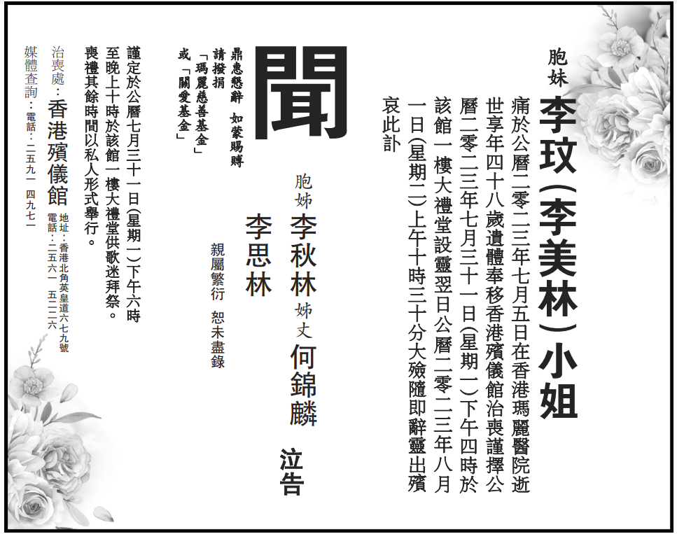讣闻的署名,则只有大姐李秋林、二姐李思林,以及李秋林老公何锦麟,未见李玟老公Bruce Rockowitz和2名继女的名字。