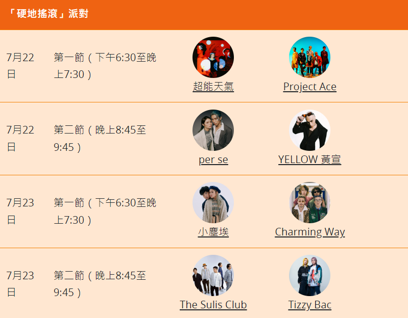 本周“维港水上音乐会”主题为“硬地摇滚派对”,邀请到per se、YELLOW 黄宣及Project Ace等本地、内地、台湾不同类型乐队表演不同曲风。