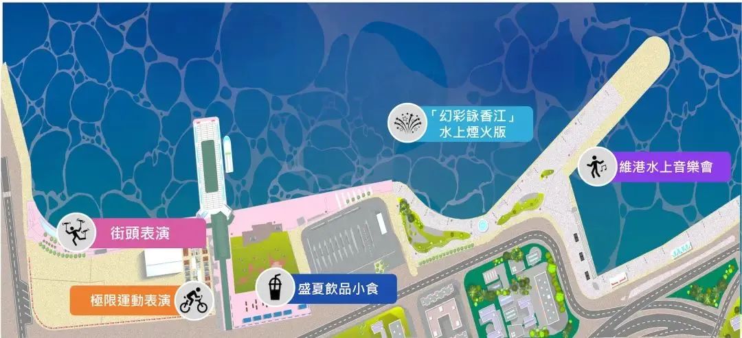同时,嘉年华在湾仔渡轮码头附近草地设有休憩区,直播音乐会表演,市民旅客可于草地观赏不同音乐风格的表演。