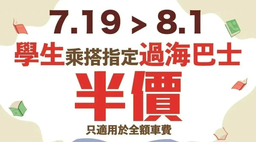 由7月19日至8月1日期间,合资格持有“学生身份”个人八达通的学生,可享30条过海线半价优惠。半价优惠只适用于全额车费,同一优惠同日内使用次数不限。