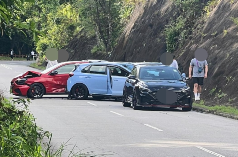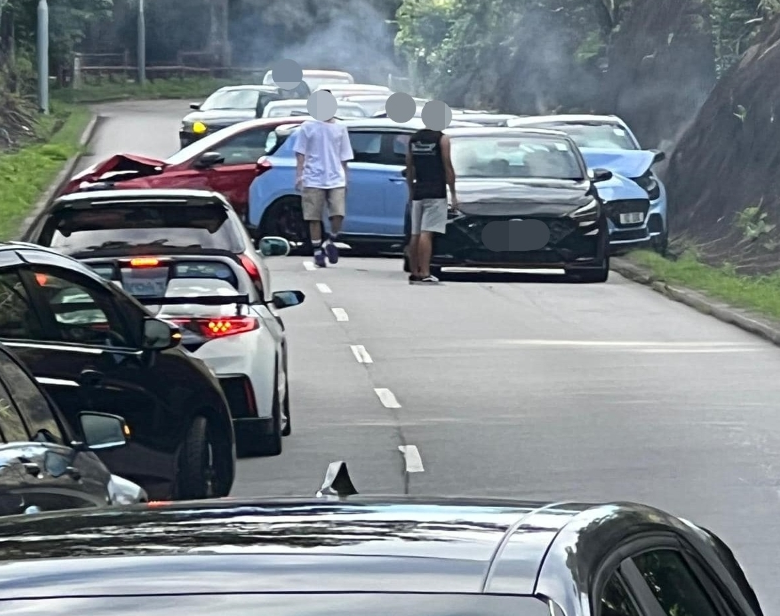 事发在今日(23日)早上7时许,一辆私家车沿新娘潭路行驶,至降下拗附近时怀疑行错线,导致9车连环相撞。有私家车被撞至车头损毁,横亘路中,冒出白烟。