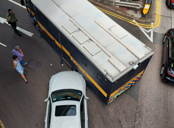 事发于今日(28日)下午3时许,一辆白色私家车沿金钟道行驶,准备转入军器厂街时,与惩教署一辆囚车相撞。私家车车头损毁,地面散落碎片,囚车车身亦遗下花痕。据现场消息指,囚车当时载有犯人,需由另一辆囚车接载离开。