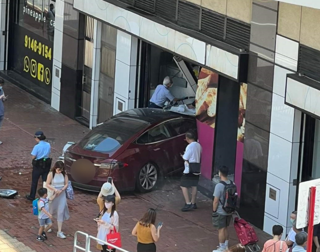 荃湾大河道88号今日(16日)下午1时许发生交通意外,一辆Tesla私家车失事,撞入湾景广场一间地舖。