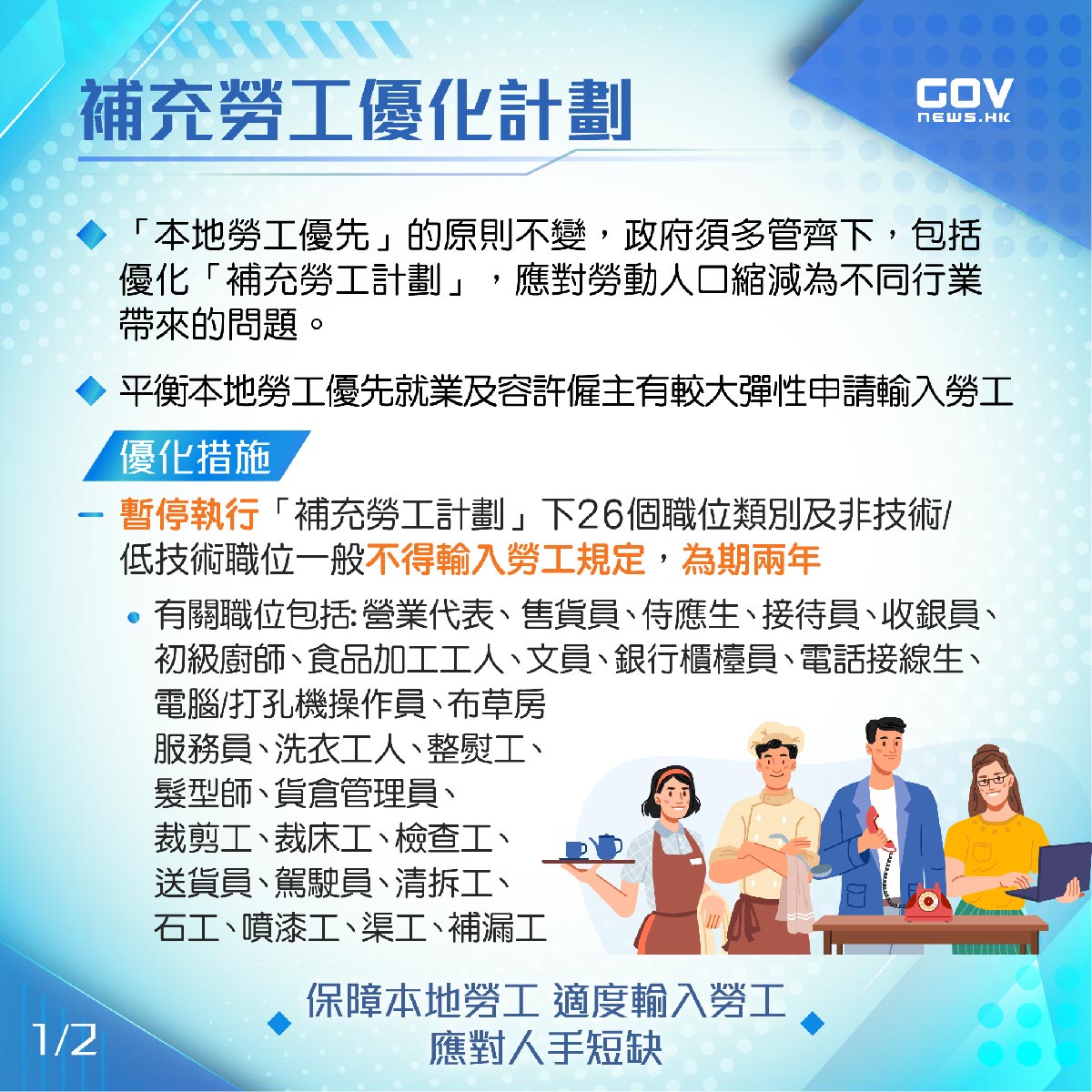 (一)暂停执行“补充劳工计划”下26个职位类别及非技术/低技术职位一般不得输入劳工的规定,为期两年;以及
