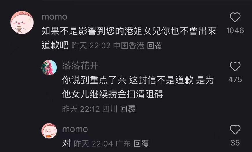 不过,网友并不“买账”。有网友怒评:“如果不是影响到您的港姐女儿,你也不会出来道歉吧。”