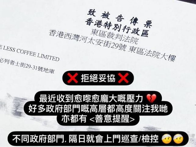 长期煽动暴力、标榜自己是“黄圈同路人”之一的上环“愿×光咖啡馆”,前晚突然在社交平台上载多张法院传票及收据图片,宣称面临巨大压力,“又要上庭、又要罚款”云云。网民指该店早应“执笠”,此举只是想收档前再刮一笔走人。
