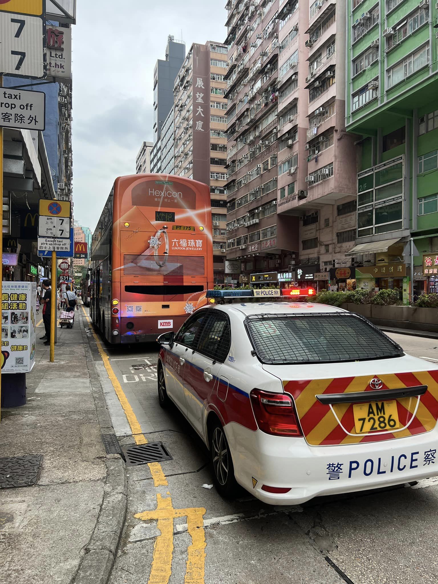 下午2时16分,一辆九巴沿油麻地弥敦道往尖沙咀方向行驶期间,在驶至弥敦道522号对开时,突然有物品从天而降击中巴士。九巴车长发现车顶遭一条长约20呎、直径约4吋的胶喉插穿,随即停车报警。警方将案列作高空堕物致车辆损毁,正调查事件起因。