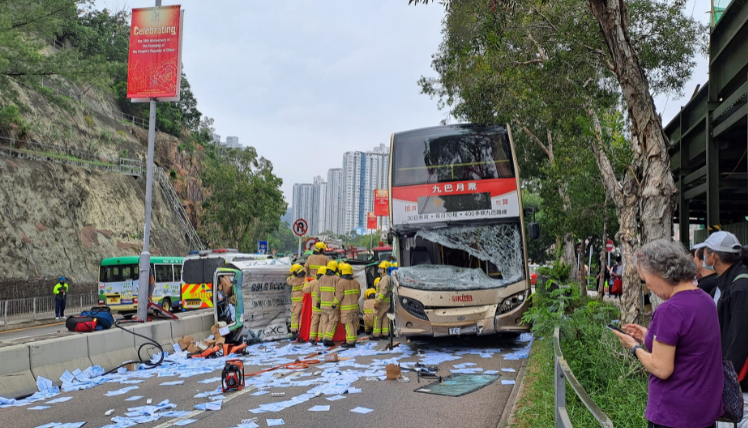 今日(18日)上午10时57分,一辆客货车沿青衣青康路行驶至近长青邨巴士总站时,疑失控剷上路中石壆,有如“炮弹飞车”般越过对面行车线,猛撼一辆双层九巴。客货车被撞至翻侧,遍地纸张。