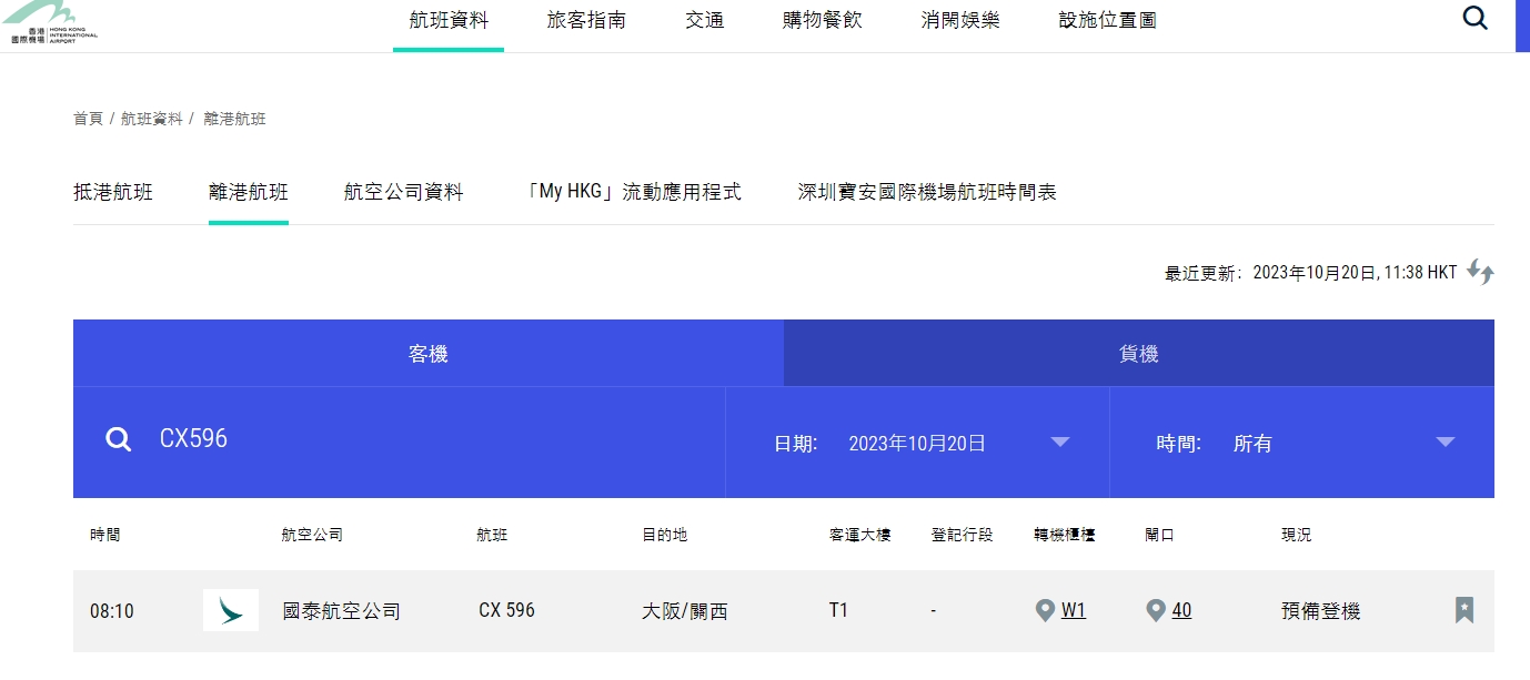 由机管局网页可见,CX596原定早上8时10分起飞,目前状态显示预备登机。