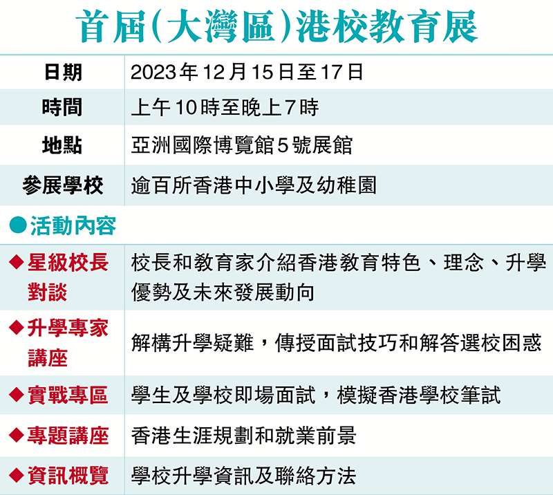 他表示,自“高才通”计划推出后,本港学校对不同地方的学生及家长的吸引力开始展现,尤其是来自大湾区内地城市的一群,然而许多内地家长对于香港的学制并不太熟悉,“对学校的收生要求、‘一条龙’学校的衔接方式,以及各个学科的教学语言等资讯都比较陌生,今次展览便是一个机会,让他们了解更多。”
