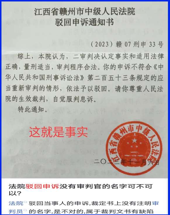 江西赣州中院驳回申诉通知书无主审人署名,你了解吗?