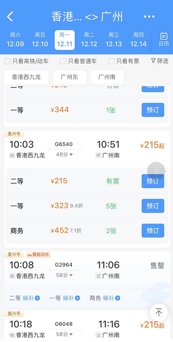 点新闻记者实测,在12306APP搜索深圳至北京的列车,在查询页面点击列车信息,可见折扣信息。记者又查看从香港出发前往广州、佛山等城市列车,亦发现折扣车票,惟多数打折坐席為一等座或商务座。