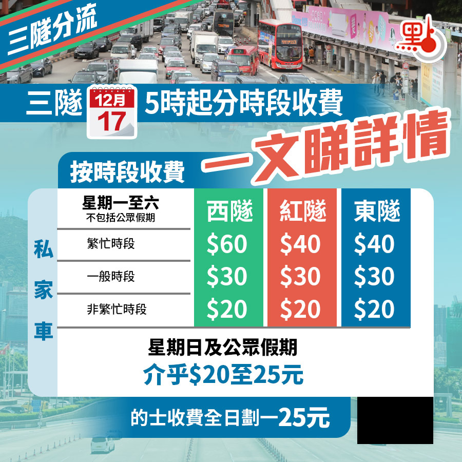 三条过海隧道周日(17日)起实施分时段收费,运输署呼吁市民毋须紧记收费时间表,只需要记住关键时间。