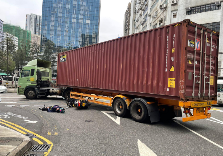 据网传事发一刻车Cam片段,涉事货柜车左转入穗禾路时,货柜拖架撞及停在旁边的电单车,电单车向左翻侧,铁骑士倒地受伤。