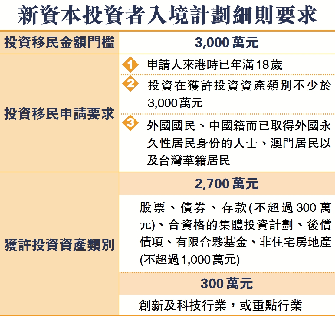 香港曾在2003年实施“投资移民”计划,最初投资门槛为650万元,2010年提升至1,000万元,有关计划最终在2015年停办。特区政府2023年10月宣布重启“投资移民”计划,申请门槛提升至3,000万元,并规定当中至少300万元要投资于支持创科的“资本投资者入境计划投资组合”,其馀2,700万元可投资的资产包括股票、债券等金融资产,以及非住宅房地产等,届时投资者即可连同其配偶、伴侣及18岁或以下未婚的子女一併享有本地的居留权。