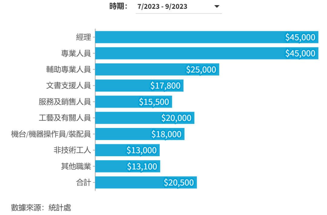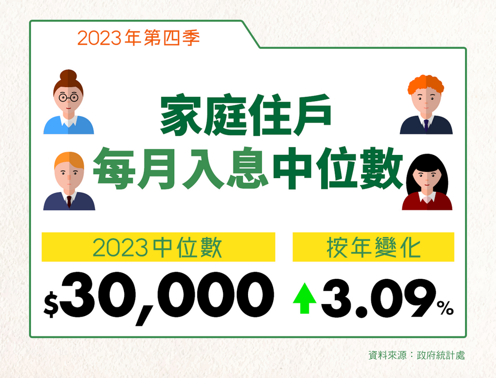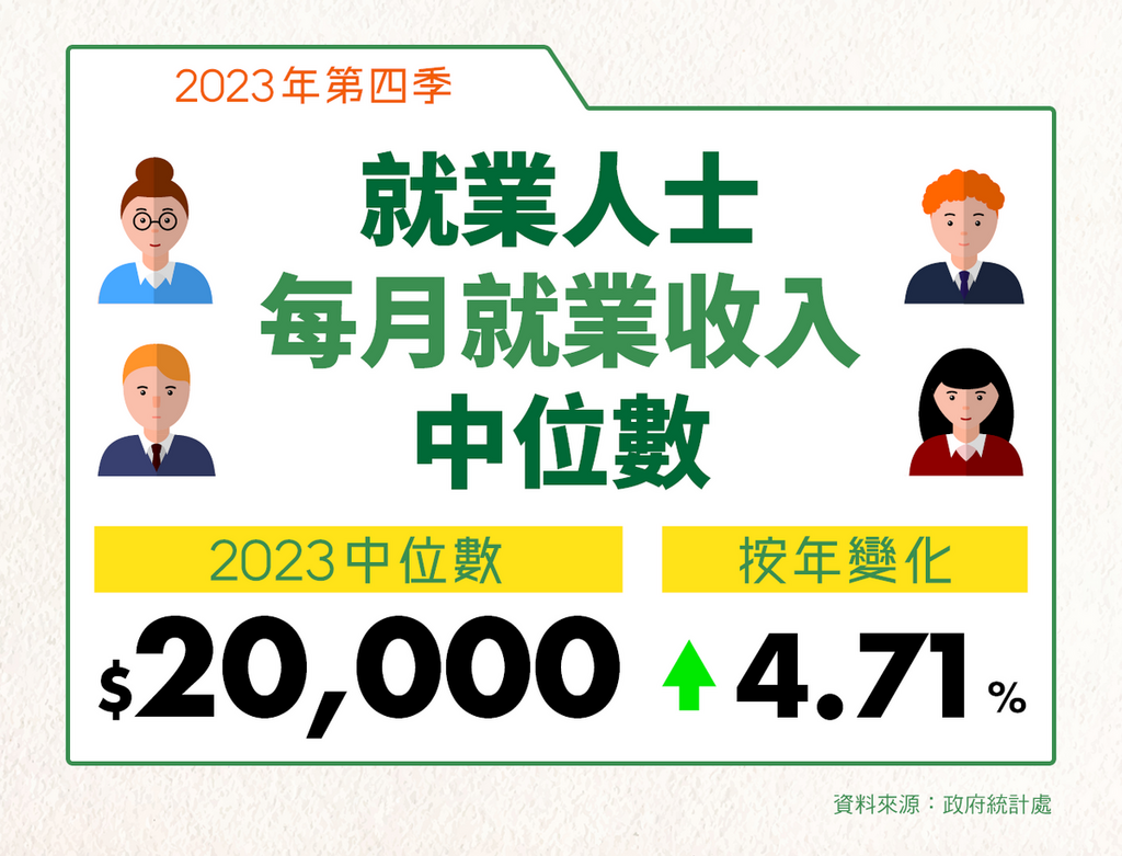 根据港府统计处最新发表的《综合住户统计调查按季统计报告2023年第4季》,本季就业人数为370.7万人,而每月就业收入中位数为2万港元(不包括外籍家庭佣工,下同)。