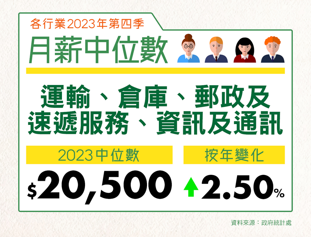 第五则是运输、仓库、邮政及速递服务、资讯及通讯,月薪中位数为2.05万港元;